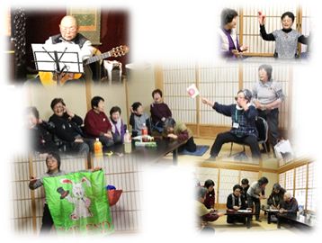 手品や井関さんのギターで歌を歌い、ビンゴゲーム、独楽回しなど、楽しく愉快なアトラクションに、ヨネサンなる闖入者が登場、抱腹絶頂のひと時を笑一杯過ごしました。