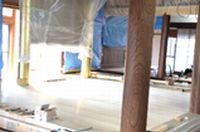 10年前修繕した境目の敷居(松)もシロアリ被害。養生が外され内陣の姿が現れました。