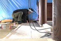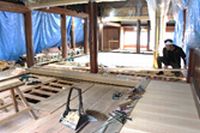 内陣に桧の床板が張られていきます。一枚ずつ丁寧に測り、床に潜っては確かめ、打ちつけられていきました。
