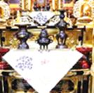 打ち敷き(仏壇の具足をお供えする白の敷織物)は左画像のように白い方を表にお掛けします。