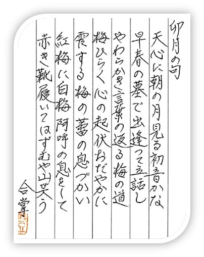 老いてゆく私も人生の真髄を探求し、梅花のように凛と美しく、楽しく過ごせる余生でありたいと存じます。