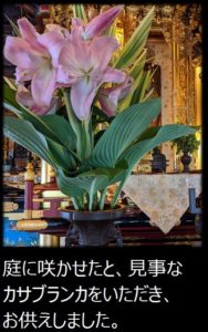 暑くなってきました、 から kyoushou | 200723 - 05:43 |220311 0.住職コラム 大暑の候、暑く、寝苦しい日が続きます。お内陣の荘厳、花がいやされることです。 仏華はお浄土の荘厳相をあらわします。 青色青光黄色黄光赤色赤光白色白光とそれぞれの色をもちながら、それぞれに光輝いているいのち。 「私たちもそれぞれに、今色をもちながらそれぞれに輝くいのちを、誰もが生きているのです。」 と、教えてくださっています。 ブックマーク パーマリンク.